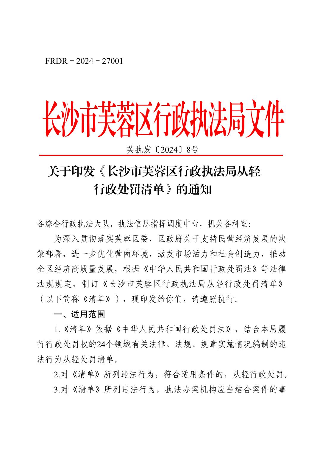 关于印发《长沙市芙蓉区行政执法局从轻行政处罚清单》的通知