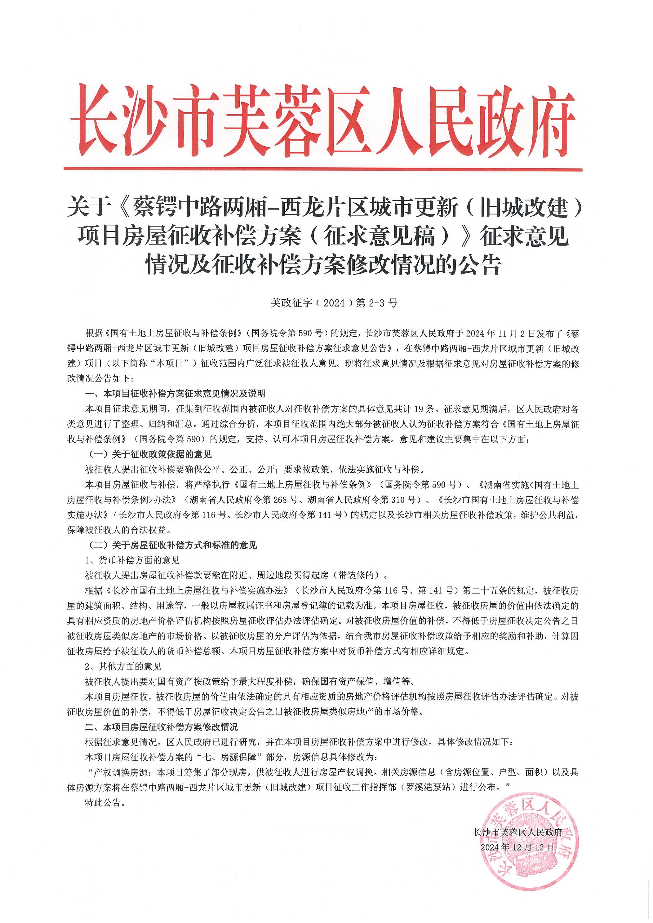 关于《蔡锷中路两厢-西龙片区城市更新(旧城改建项目房屋征收补偿方案(征求意见稿)》征求意见情况及征收补偿方案修改情况的公告