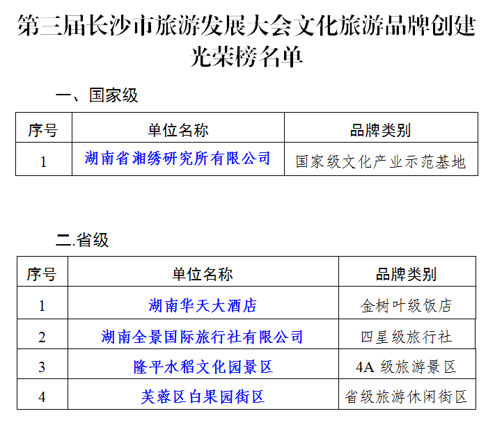 第二届长沙市旅游发展大会召开以来,全市文化旅游系统在市委、市政府的坚强领导下,大力推动了长沙文化旅游高质量发展行稳致远,交出了精彩答卷。在光荣榜名单中,来自芙蓉区的湖南省湘绣研究所有限公司上榜国家级品牌,湖南华天大酒店、湖南全景国际旅行社有限公司、隆平水稻文化园景区、芙蓉区白果园街区上榜省级品牌。