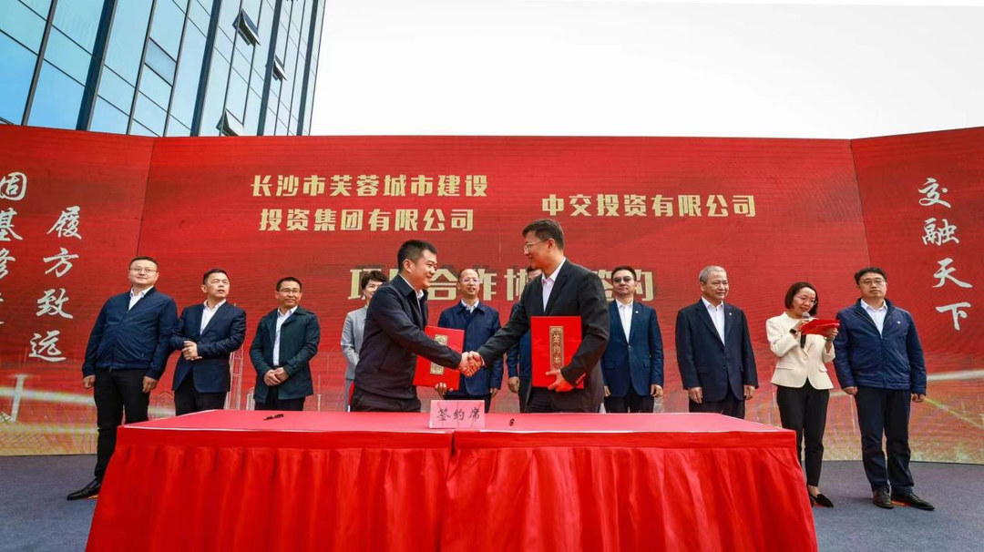 现场,中交投资公司党委委员、副总经理程天成与长沙市芙蓉城市建设投资集团有限公司董事长易幸现场签约,蔡奉祥、周春晖为长沙中交芙蓉城市更新投资有限公司进行揭牌。